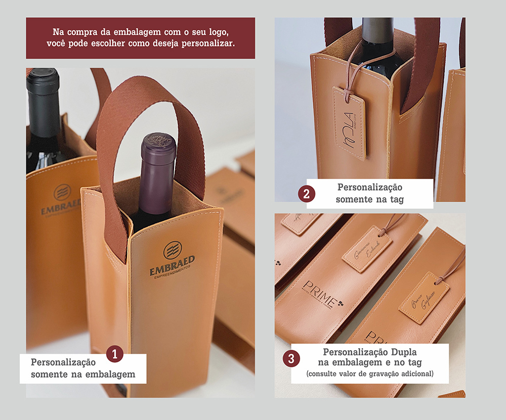 A personalização é feita por gravação a laser, garantindo alta precisão e durabilidade. O resultado é fiel às fotos apresentadas, sem uso de tintas, o que assegura que a gravação não desbote com o tempo. Atenção: o valor contempla gravação apenas na tag. Para gravar o corpo da embalagem, entre em contato conosco.