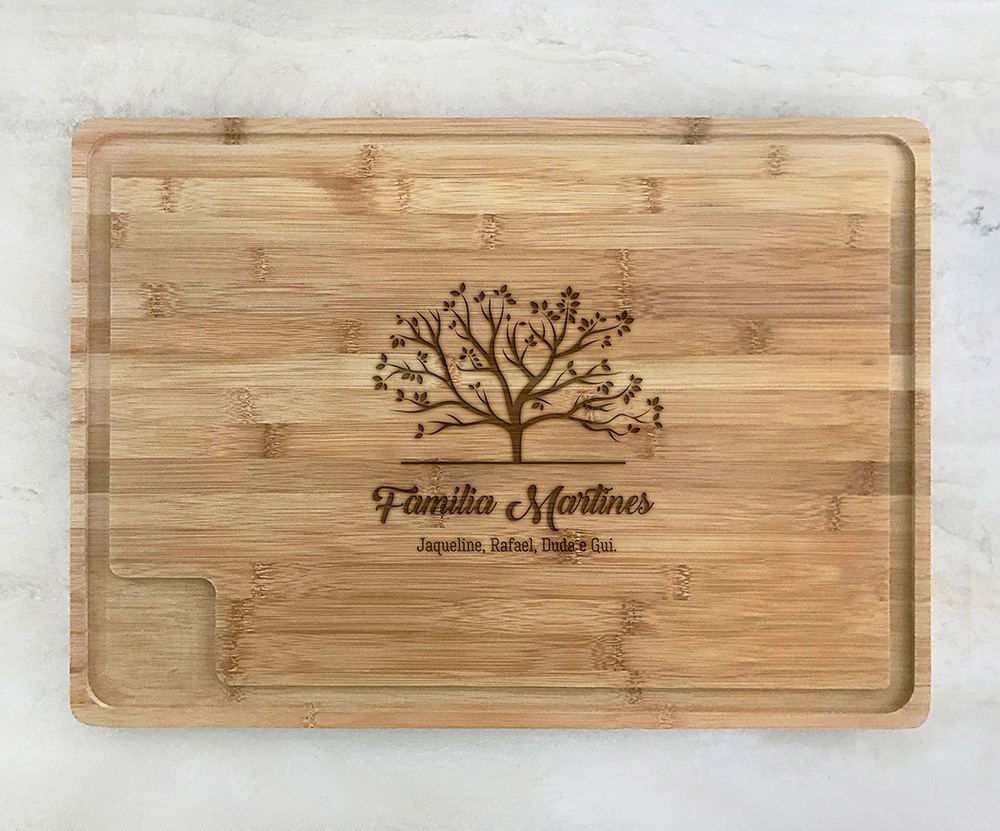 Produto Natural: Por se tratar de bambu, podem ocorrer variações na tonalidade da tábua e na gravação, tornando cada unidade exclusiva.